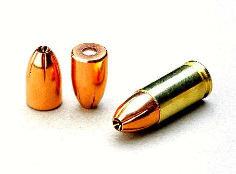 - Pocisk JHP hexagon w płaszczu mosiężnym o wadze 8 g (124 gr)
