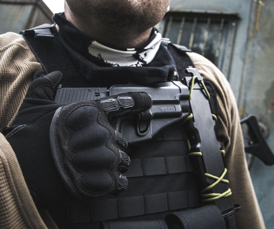 Kabura podsiada regulowany kąt pochylenia w zakresie 360 stopni. W połączeniu z dwoma montażami: płetwą do pasa i montażem do systemu PALS otrzymujemy jedną kaburę którą możemy montować na pasach wszelkiego typu i na kamizelkach taktycznych.